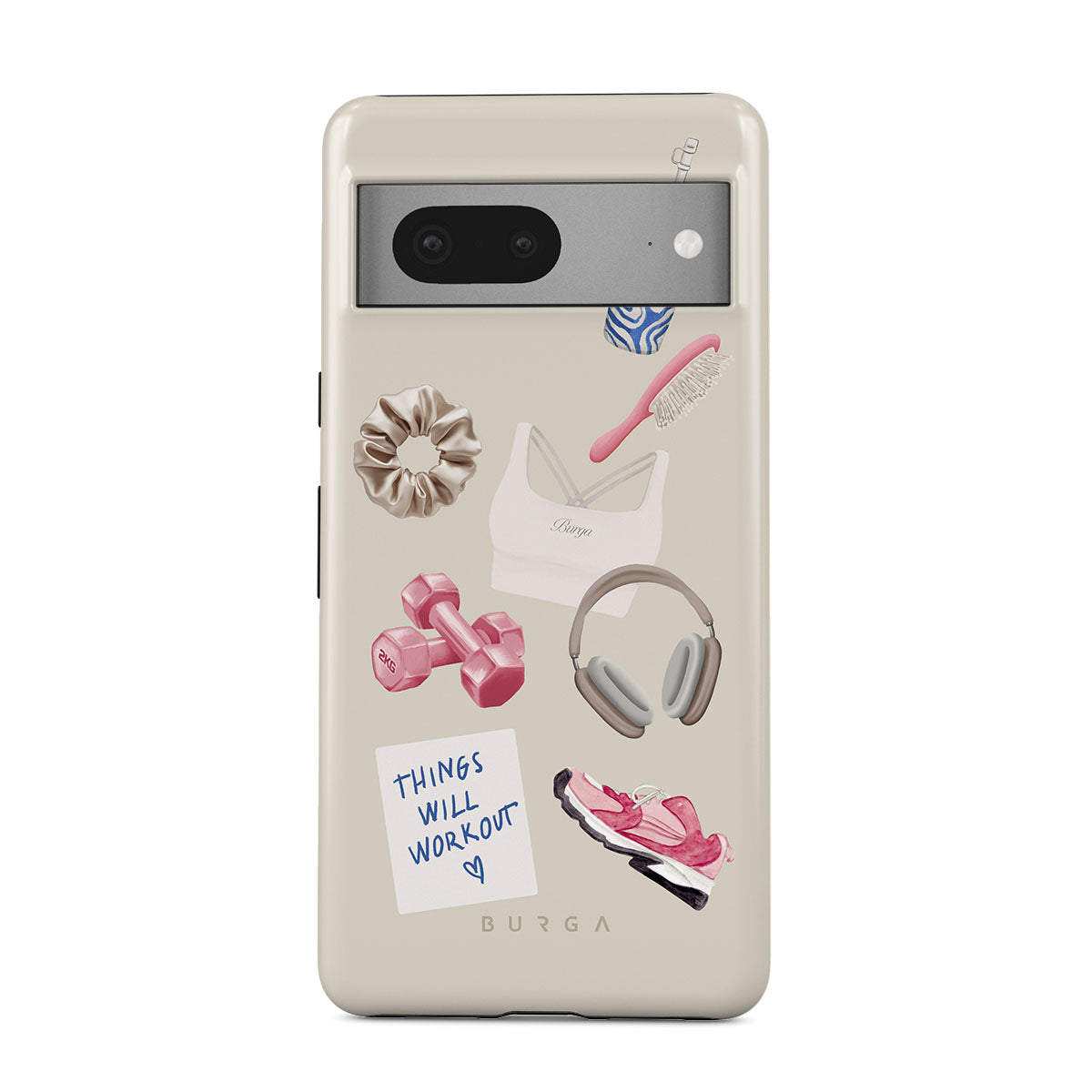 This design features: dumbbells, headphones, tumbler, hairbrush, pink trainers, sports bra, crunchie, "Things Will Work Out" sticky note