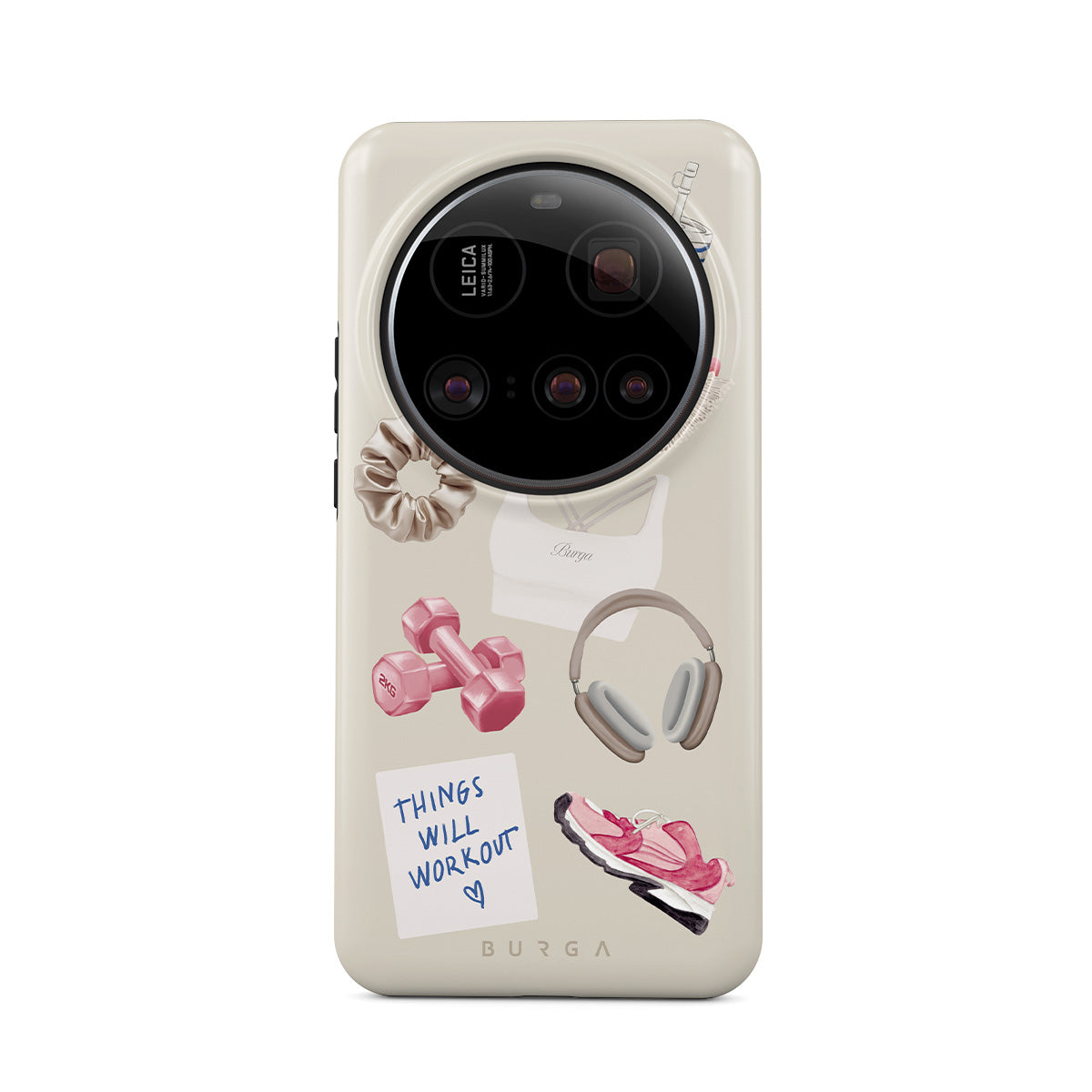 This design features: dumbbells, headphones, tumbler, hairbrush, pink trainers, sports bra, crunchie, "Things Will Work Out" sticky note