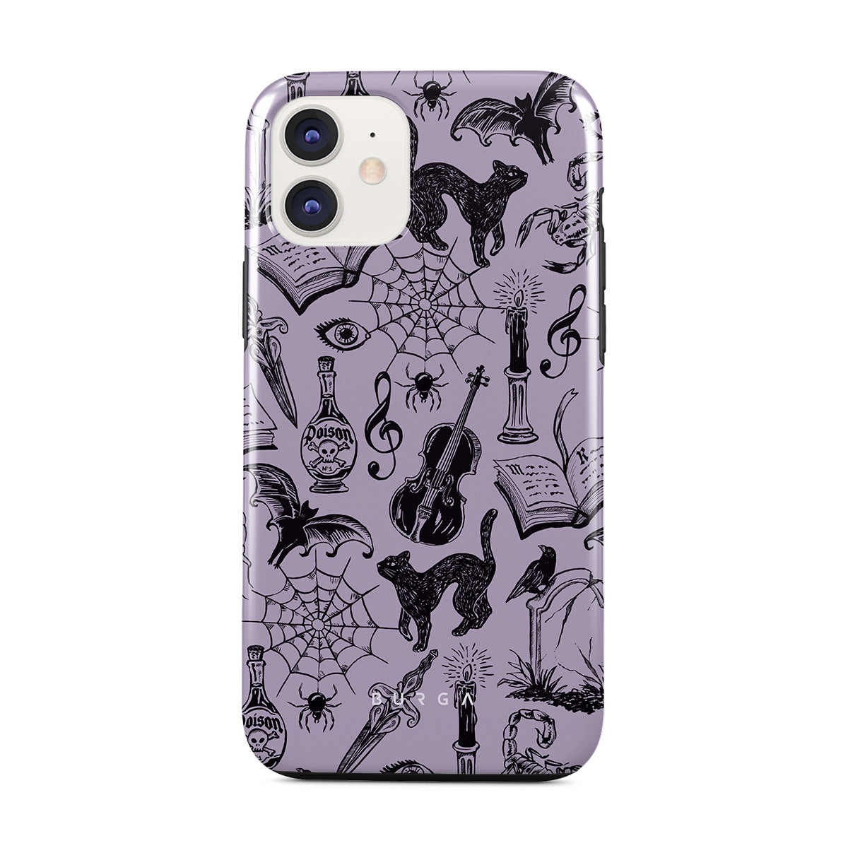This design features: gothic doodles, mystical elements, spiders, spiderweb, cat, violin, eye, candle, dagger, book, bat, crow, scorpion