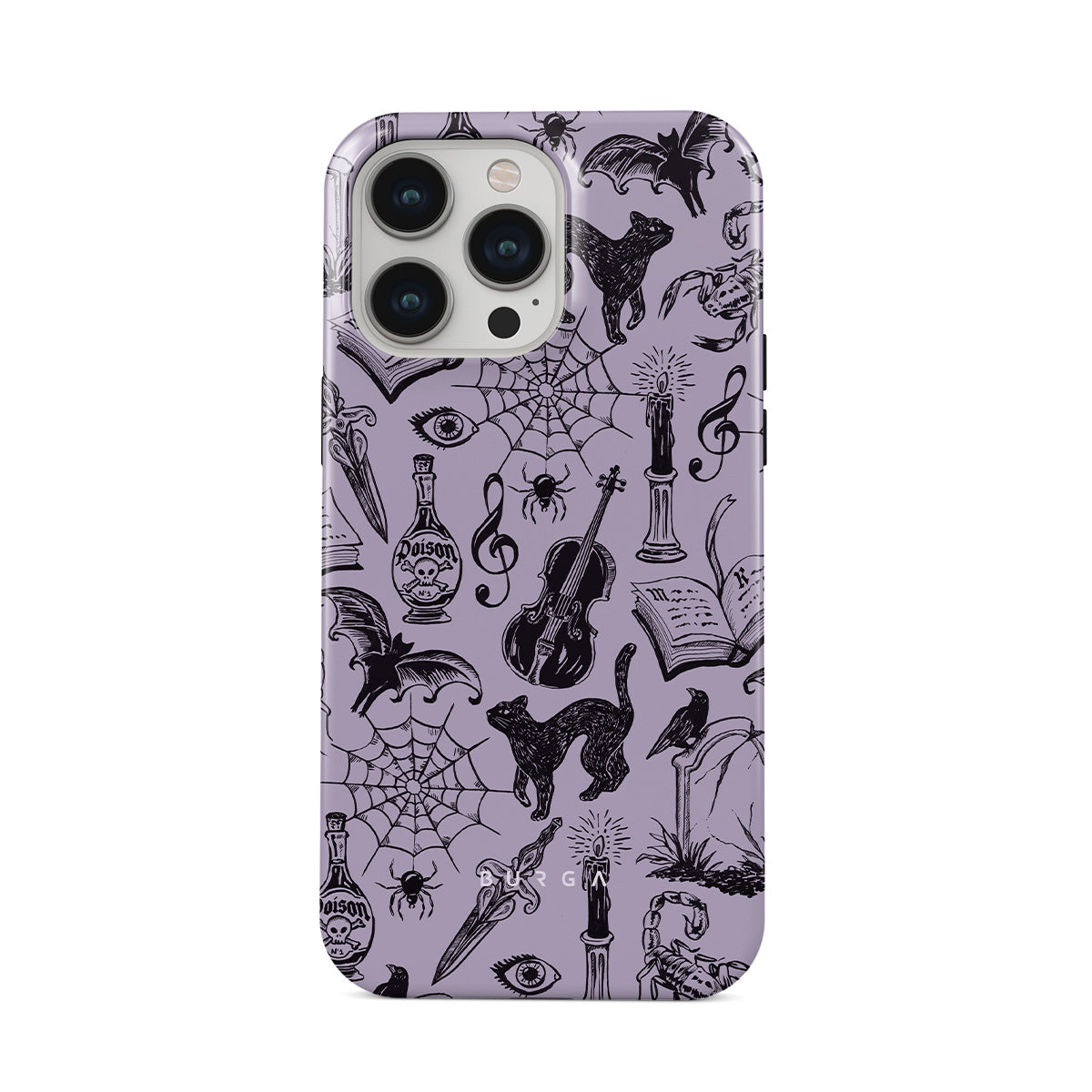 This design features: gothic doodles, mystical elements, spiders, spiderweb, cat, violin, eye, candle, dagger, book, bat, crow, scorpion