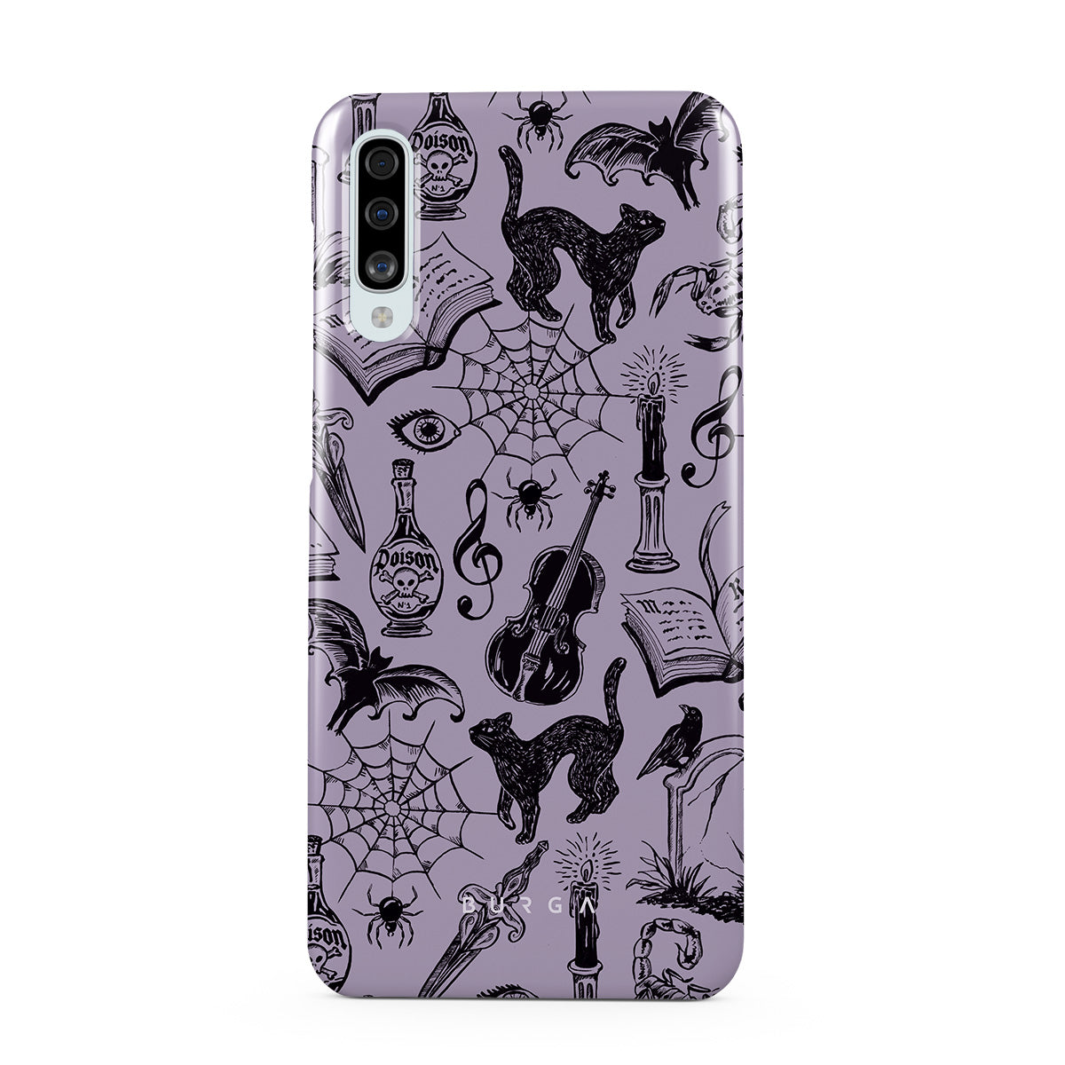 This design features: gothic doodles, mystical elements, spiders, spiderweb, cat, violin, eye, candle, dagger, book, bat, crow, scorpion