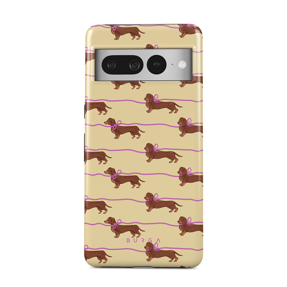 This Google Pixel 7 Pro phone case design doesn’t believe in time, only vibes. It features sassy sausage dogs with bows who, like you, are running 15 minutes behind—and blaming Mercury.