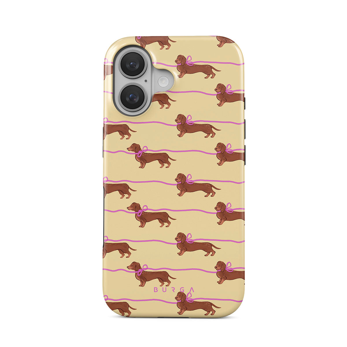 This iPhone 16 Plus phone case design doesn’t believe in time, only vibes. It features sassy sausage dogs with bows who, like you, are running 15 minutes behind—and blaming Mercury.