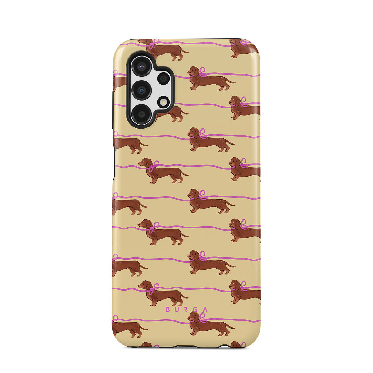 This Samsung Galaxy A13 4G phone case design doesn’t believe in time, only vibes. It features sassy sausage dogs with bows who, like you, are running 15 minutes behind—and blaming Mercury.