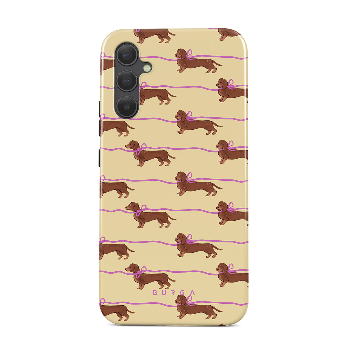 This Samsung Galaxy A34 phone case design doesn’t believe in time, only vibes. It features sassy sausage dogs with bows who, like you, are running 15 minutes behind—and blaming Mercury.