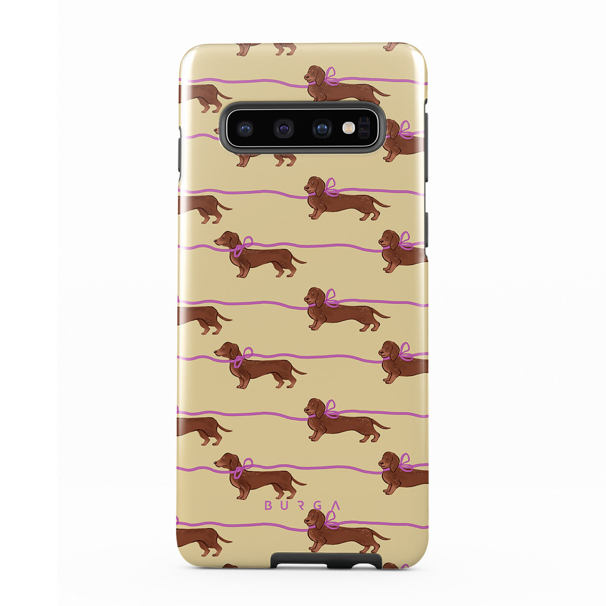 This Samsung Galaxy S10 4G phone case design doesn’t believe in time, only vibes. It features sassy sausage dogs with bows who, like you, are running 15 minutes behind—and blaming Mercury.