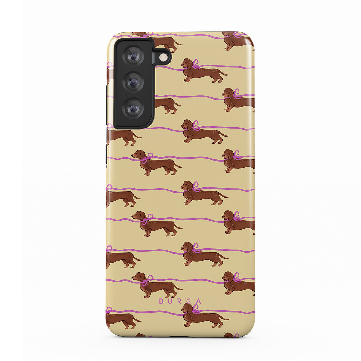This Samsung Galaxy S21 FE phone case design doesn’t believe in time, only vibes. It features sassy sausage dogs with bows who, like you, are running 15 minutes behind—and blaming Mercury.