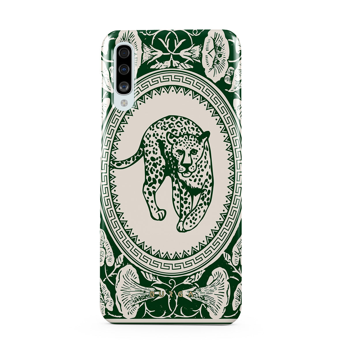 Our Antique Samsung Galaxy A50 phone case designa nude canvas kissed by refined green contours, painting an eternal saga of elegance. Enthroned at its center is a regal leopard embraced by a tender floral caress. A nod to timeless opulence, this design captures the essence of vintage prestige.