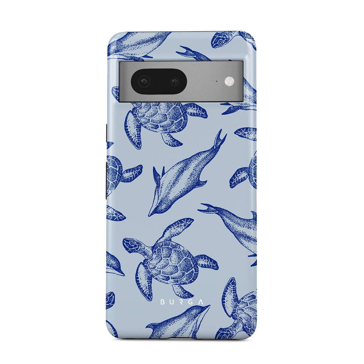 A beautiful design featuring lively turtles and dolphins playfully dancing in serene light blue water. Dive into the ocean's rhythm with our Aquatic Dance Google Pixel 7 case.