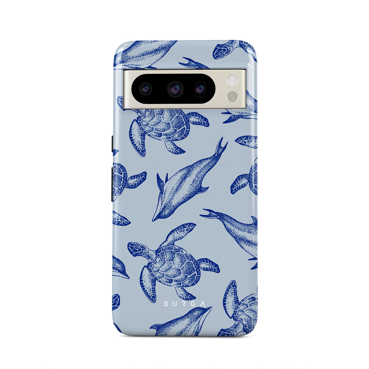 A beautiful design featuring lively turtles and dolphins playfully dancing in serene light blue water. Dive into the ocean's rhythm with our Aquatic Dance Google Pixel 8 Pro case.