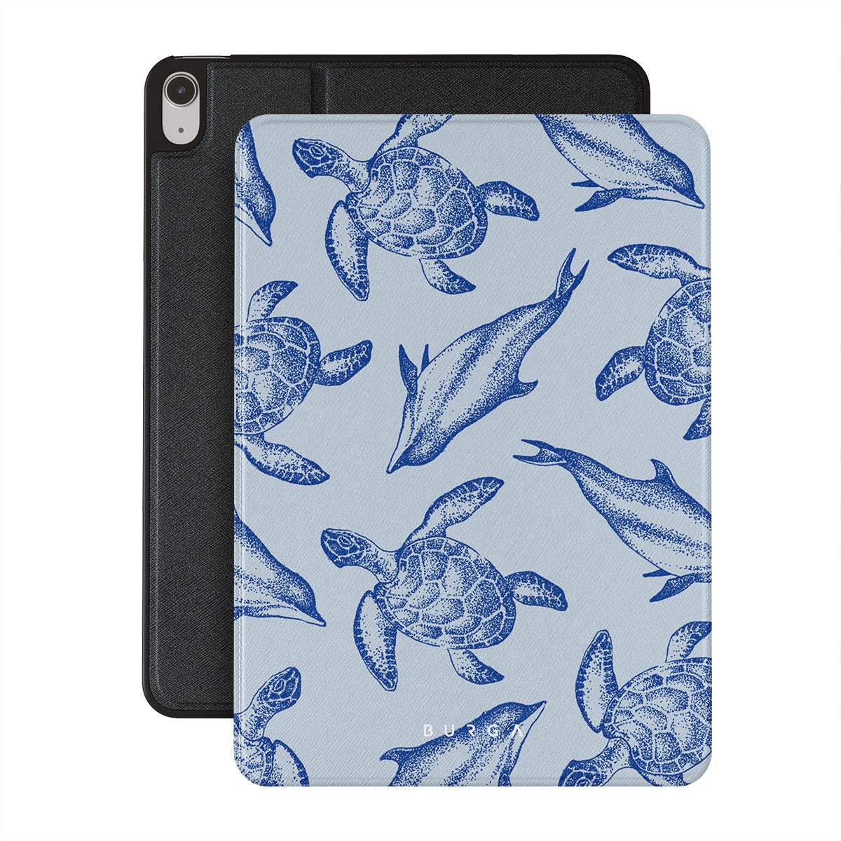 A beautiful design featuring lively turtles and dolphins playfully dancing in serene light blue water. Dive into the ocean's rhythm with our Aquatic Dance iPad Air 11 (7th/6th Gen) folio case.