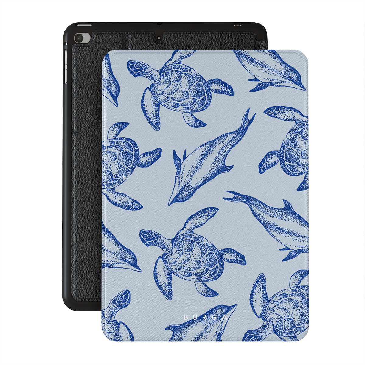 A beautiful design featuring lively turtles and dolphins playfully dancing in serene light blue water. Dive into the ocean's rhythm with our Aquatic Dance iPad Mini 7.9 (5th Gen) folio case.