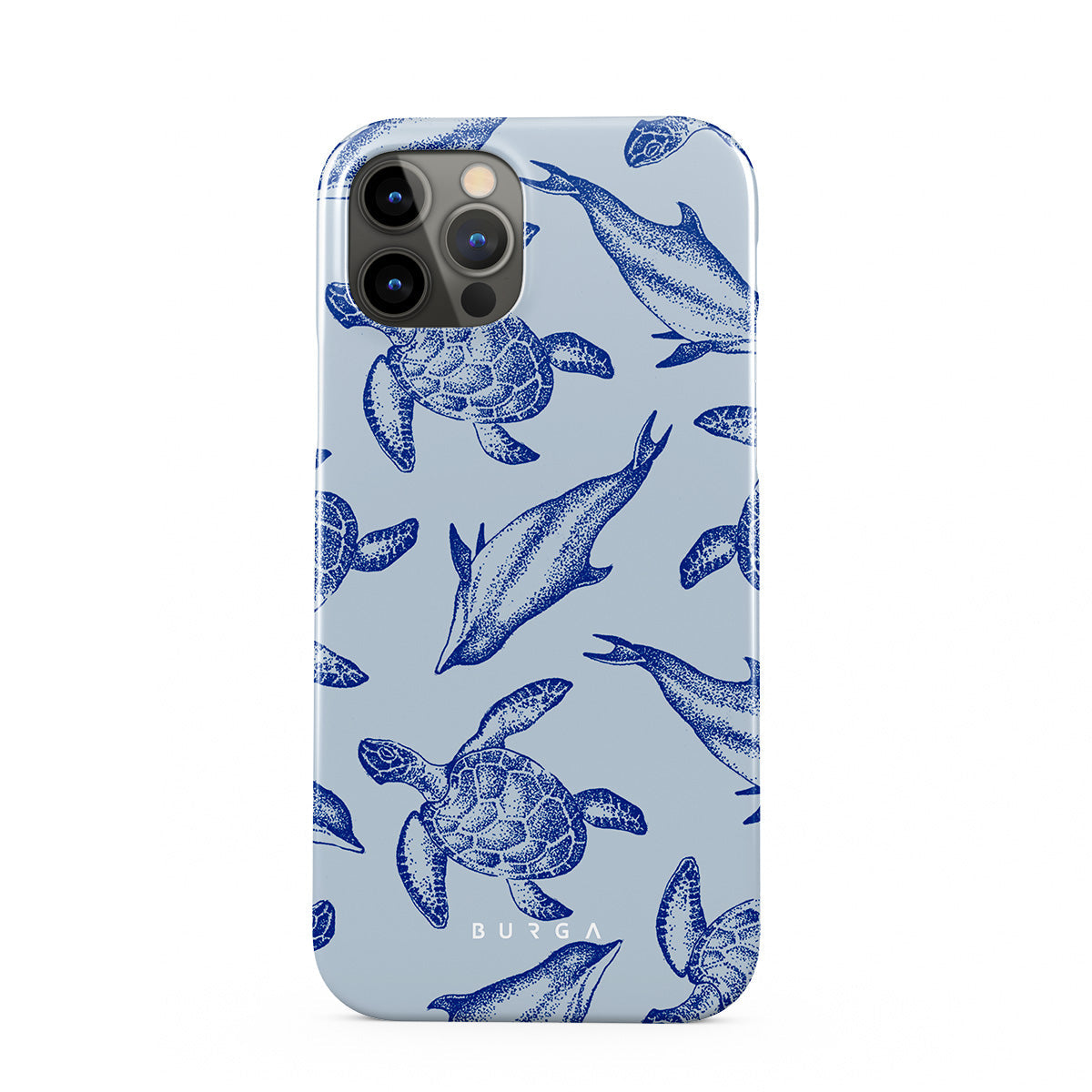 A beautiful design featuring lively turtles and dolphins playfully dancing in serene light blue water. Dive into the ocean's rhythm with our Aquatic Dance iPhone 12 Pro Max case.