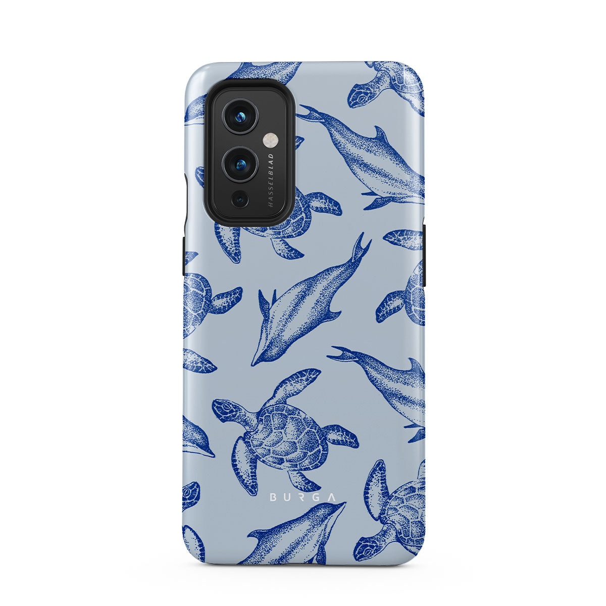 A beautiful design featuring lively turtles and dolphins playfully dancing in serene light blue water. Dive into the ocean's rhythm with our Aquatic Dance OnePlus 9 Pro case.