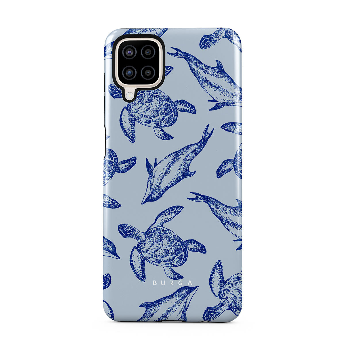 A beautiful design featuring lively turtles and dolphins playfully dancing in serene light blue water. Dive into the ocean's rhythm with our Aquatic Dance Samsung Galaxy A12 4G case.