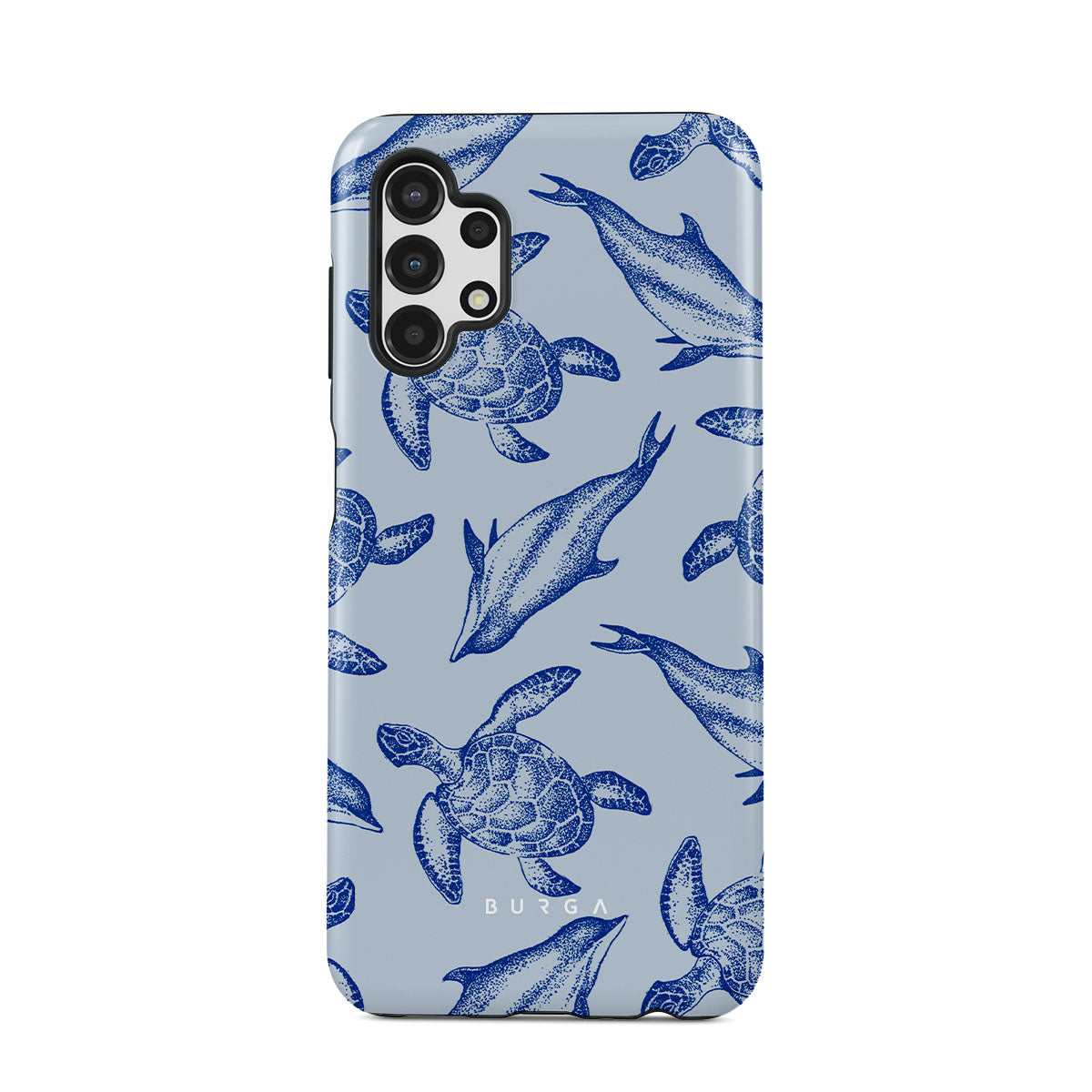 A beautiful design featuring lively turtles and dolphins playfully dancing in serene light blue water. Dive into the ocean's rhythm with our Aquatic Dance Samsung Galaxy A13 4G case.