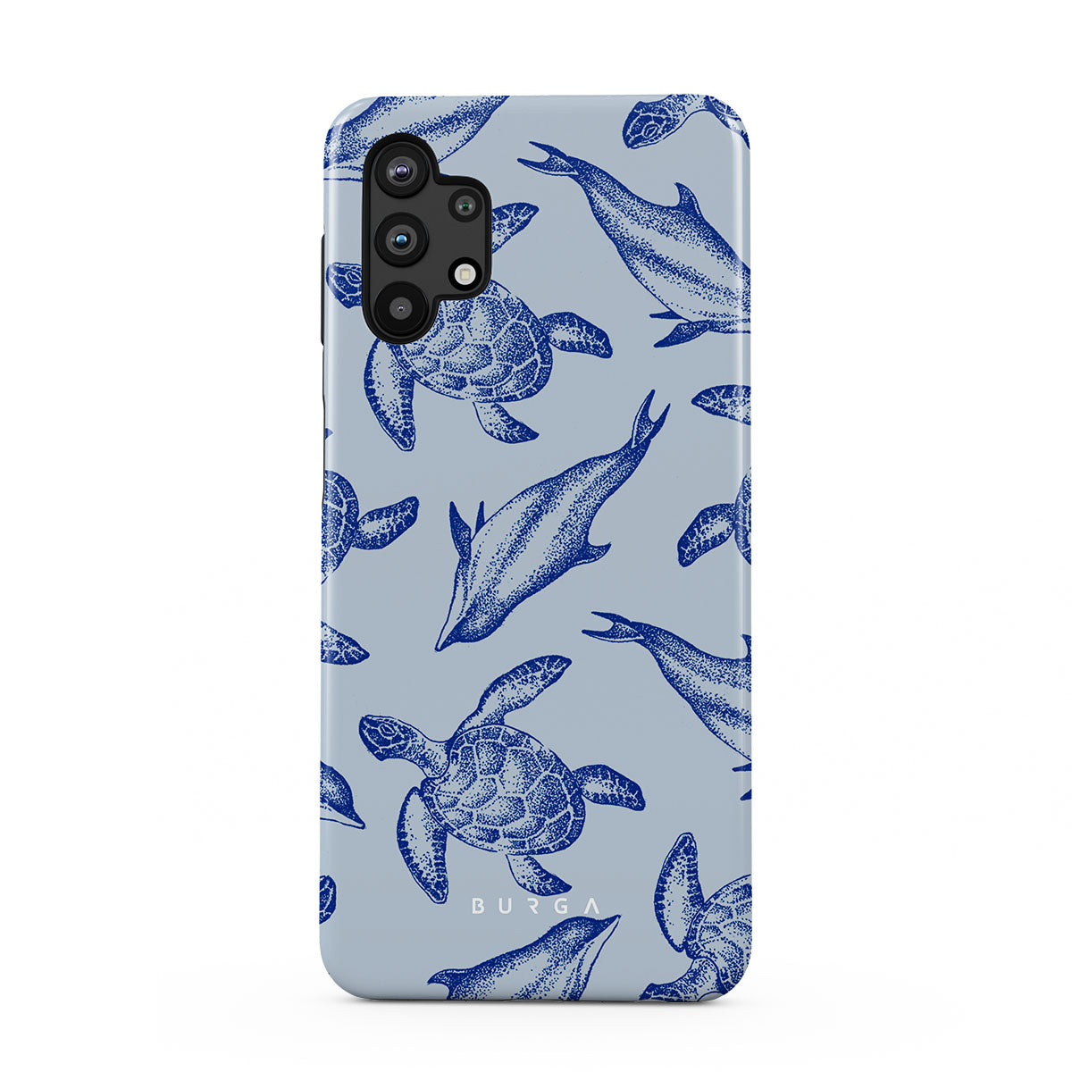 A beautiful design featuring lively turtles and dolphins playfully dancing in serene light blue water. Dive into the ocean's rhythm with our Aquatic Dance Samsung Galaxy A32 5G case.
