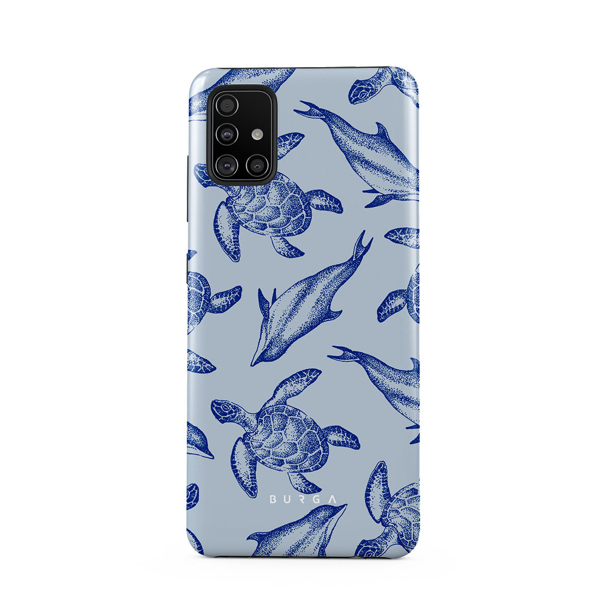 A beautiful design featuring lively turtles and dolphins playfully dancing in serene light blue water. Dive into the ocean's rhythm with our Aquatic Dance Samsung Galaxy A51 4G case.