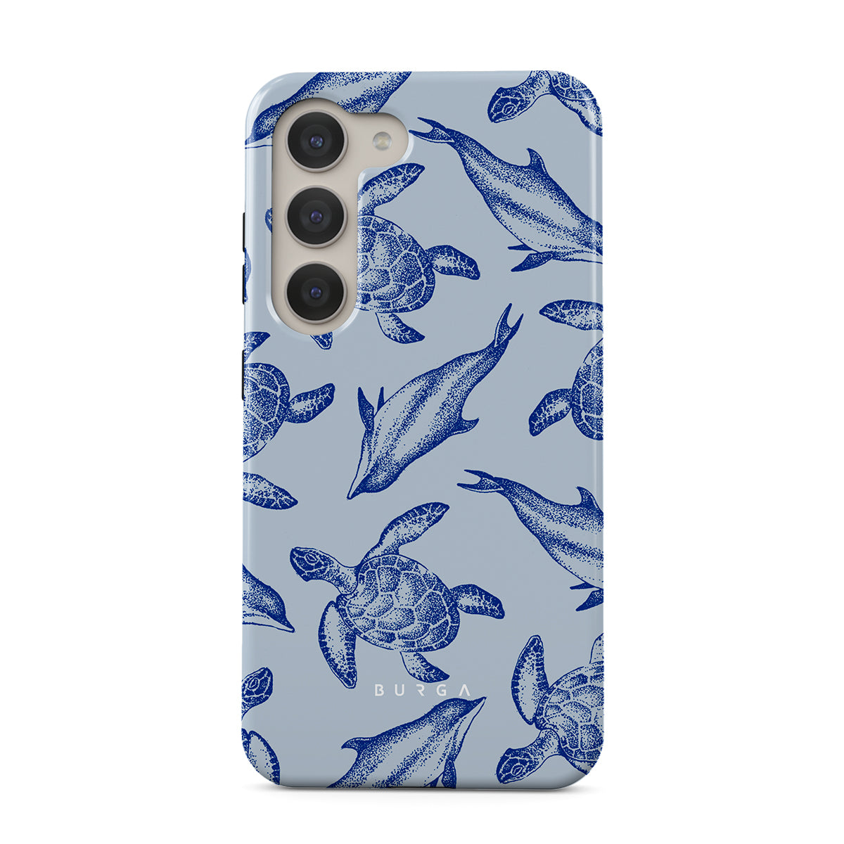 A beautiful design featuring lively turtles and dolphins playfully dancing in serene light blue water. Dive into the ocean's rhythm with our Aquatic Dance Samsung Galaxy S23 case.