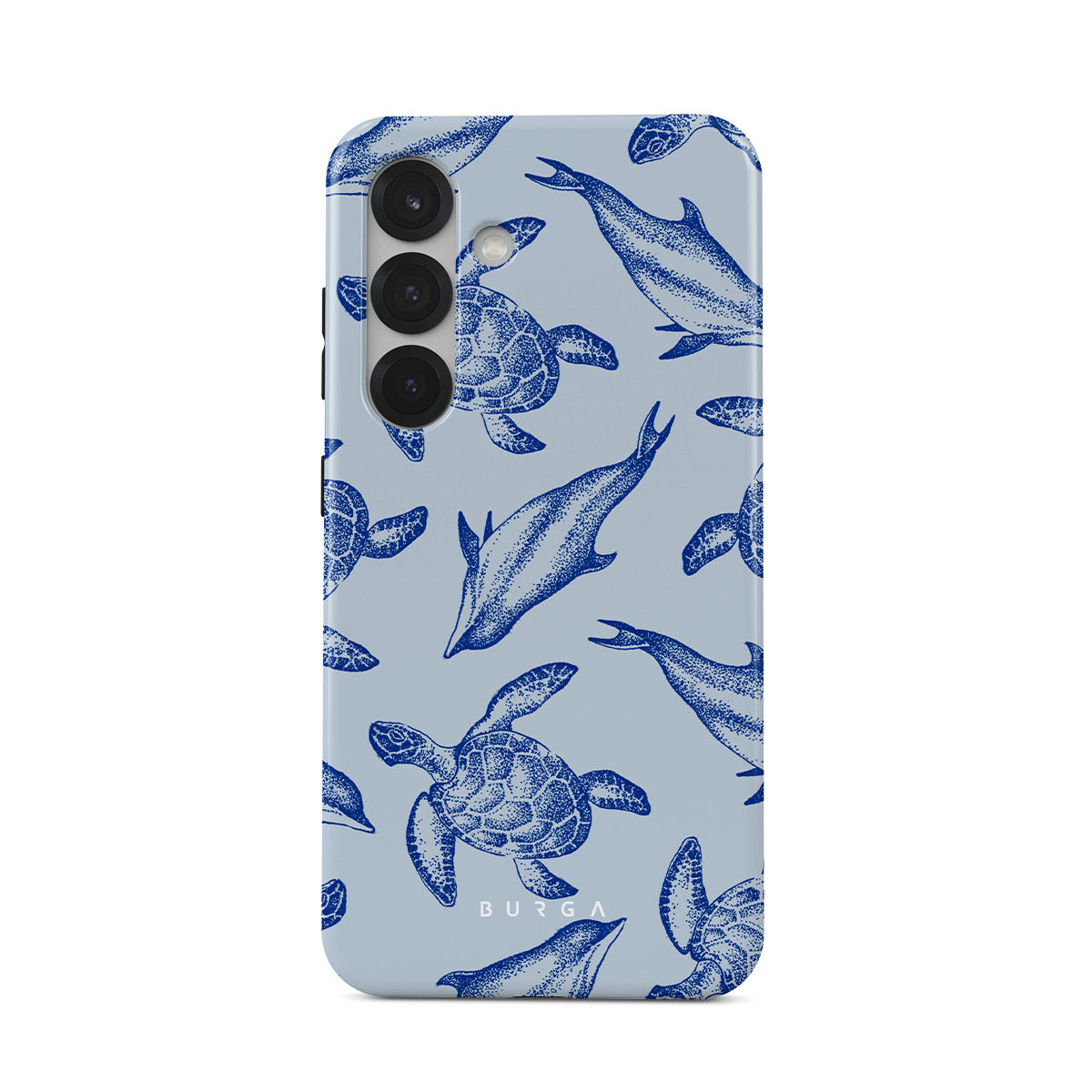 A beautiful design featuring lively turtles and dolphins playfully dancing in serene light blue water. Dive into the ocean's rhythm with our Aquatic Dance Samsung Galaxy S25 Plus case.