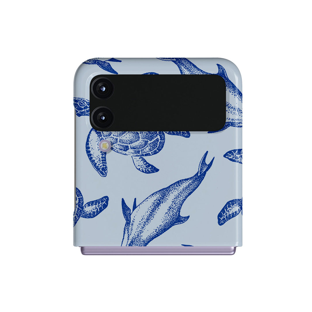 A beautiful design featuring lively turtles and dolphins playfully dancing in serene light blue water. Dive into the ocean's rhythm with our Aquatic Dance Samsung Galaxy Z Flip 4 case.