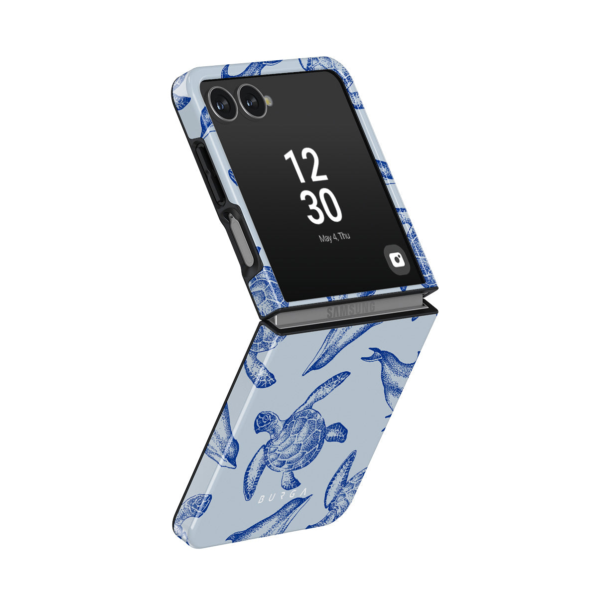 A beautiful design featuring lively turtles and dolphins playfully dancing in serene light blue water. Dive into the ocean's rhythm with our Aquatic Dance Samsung Galaxy Z Flip 7 case.