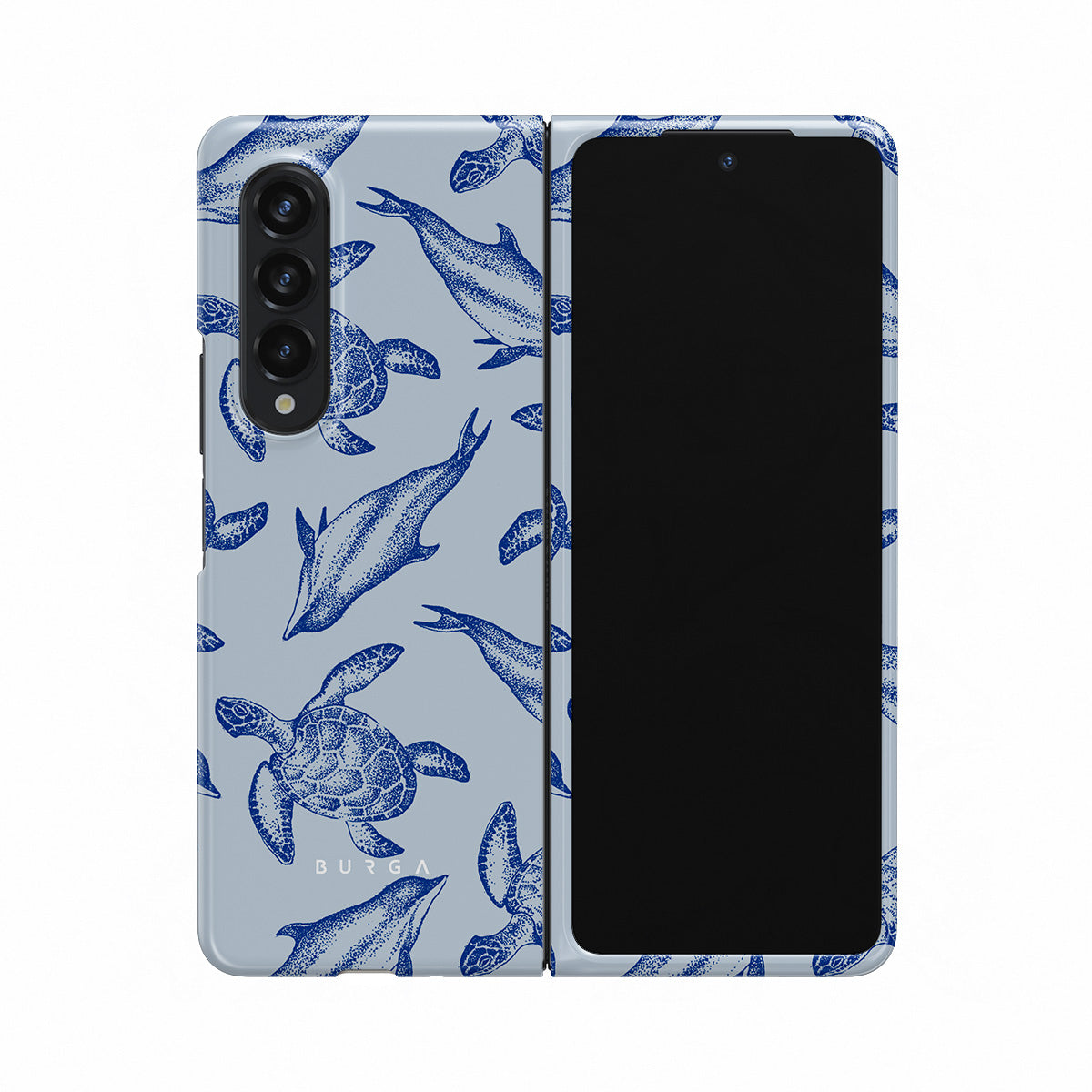 A beautiful design featuring lively turtles and dolphins playfully dancing in serene light blue water. Dive into the ocean's rhythm with our Aquatic Dance Samsung Galaxy Z Fold 3 case.