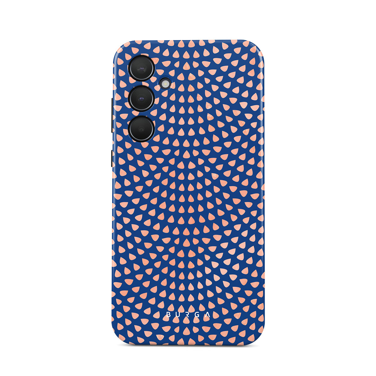 Rose gold teardrops meet a deep shade of blue in our Azure Waters Samsung Galaxy A35 phone case and create the duo worth taking with you every evening out. Add a touch of strictness with the symmetrical teardrops pattern paving the way and keeping your phone out of harm's way with the case that is as protective as it is beautiful.