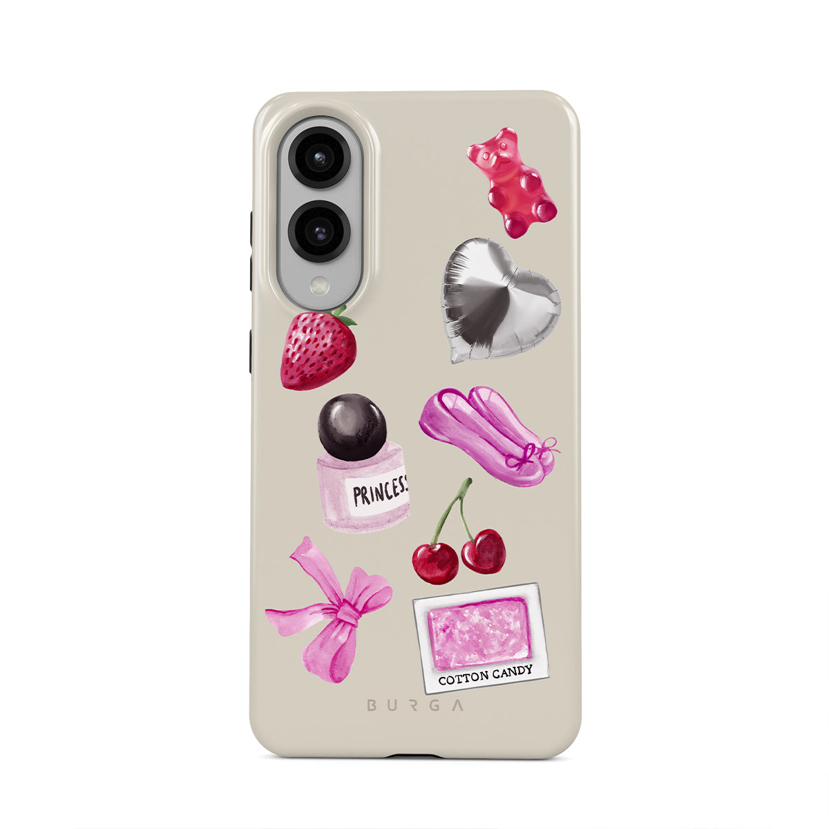 This design features: pink bow, heart-shaped silver balloon, perfume bottle, strawberry, cherries, pink ballet slippers, cotton candy sticker, pink gummy bear