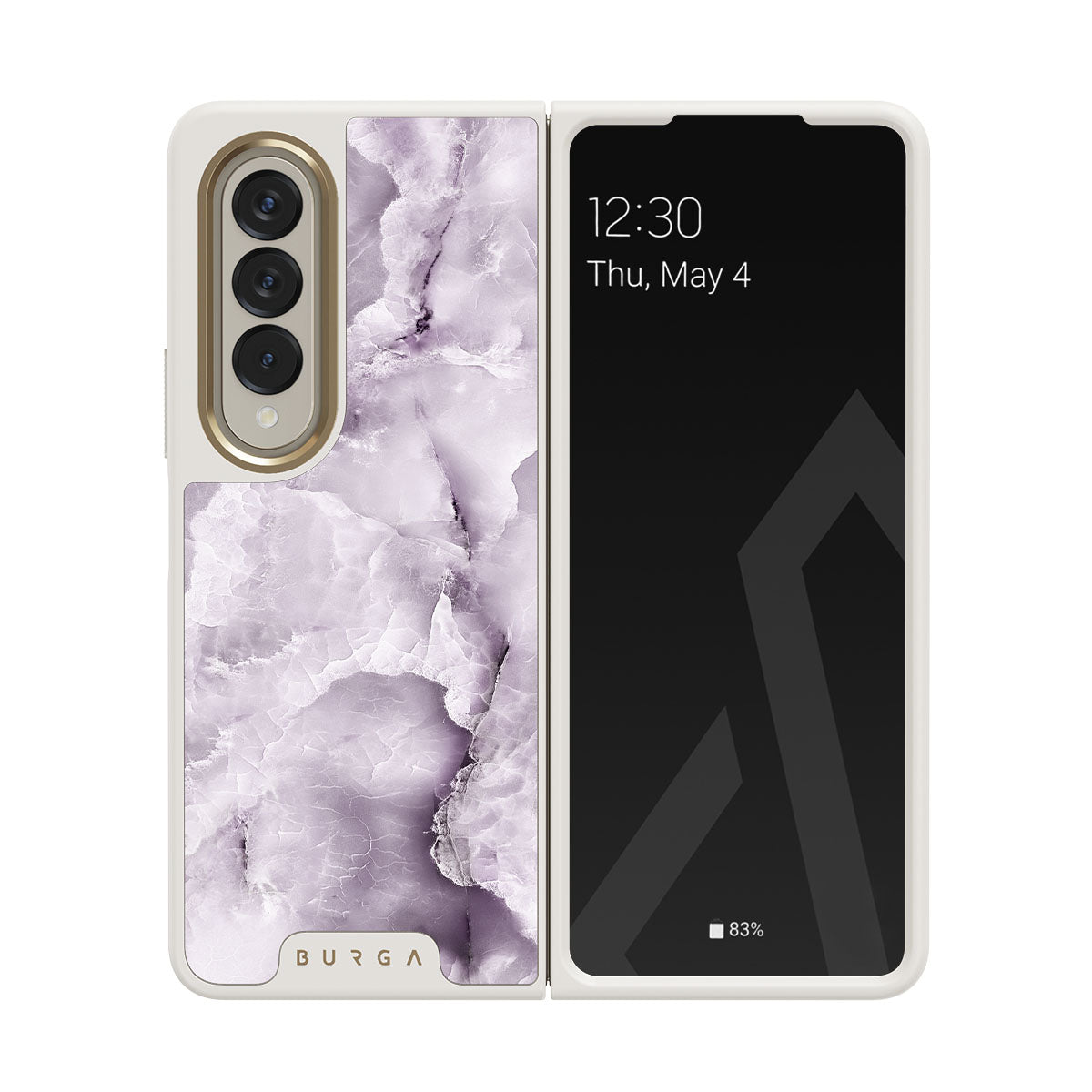 The gray violet-colored Black Currant Samsung Galaxy Z Fold 4 phone case showcases a soft marble design that will add a touch of luxury to your style. The color itself represents the future and dreams, yet the nature of it offers a calming effect. Keep a piece of serenity in your hands.