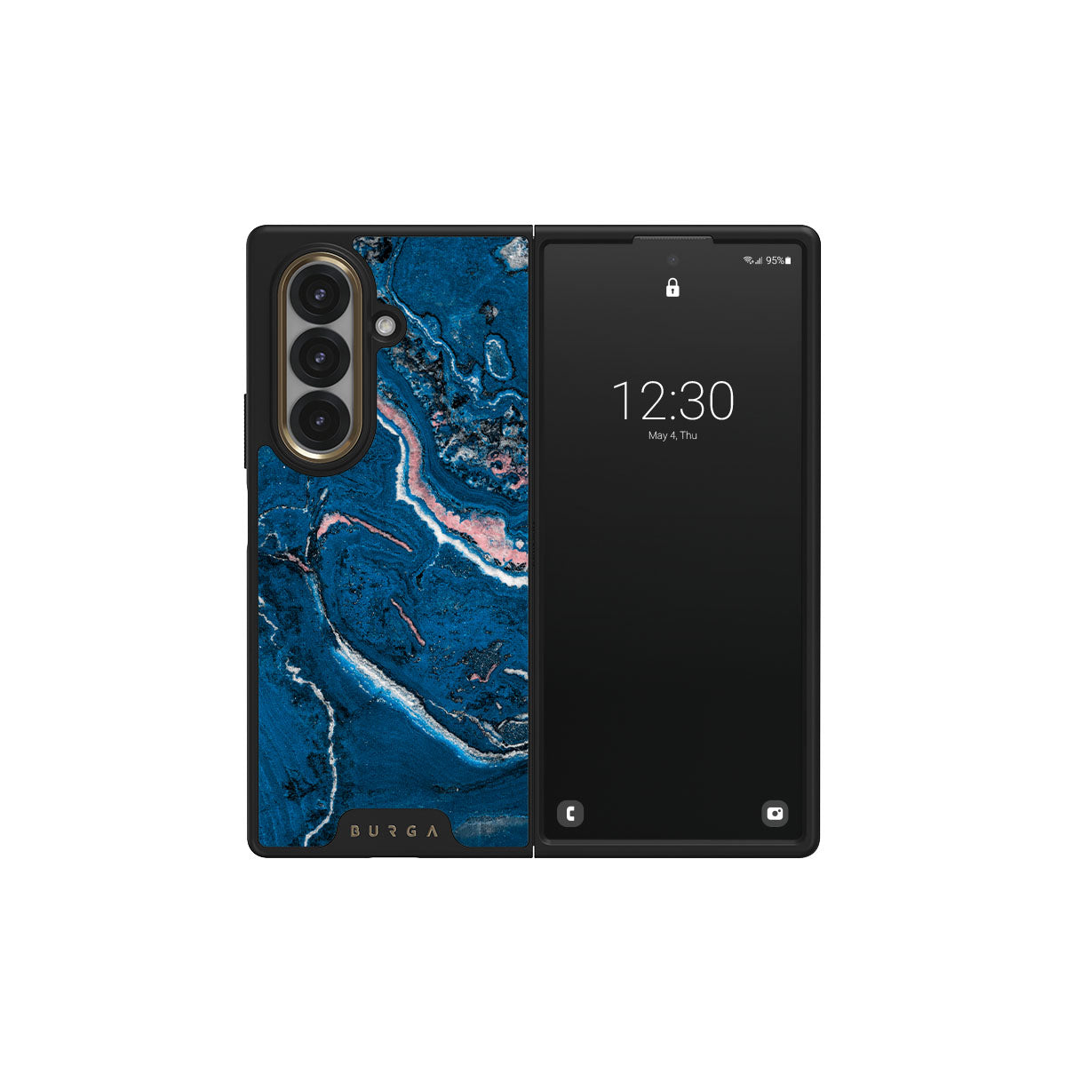 Electric indigo blue meets white, and pastel pink swirls in a unique marble pattern in our Blue Lagoon Samsung Galaxy Z Fold 7 phone case. The modern take on a blue marble trend will look aesthetically pleasing on your device while offering durable protection from any falls.