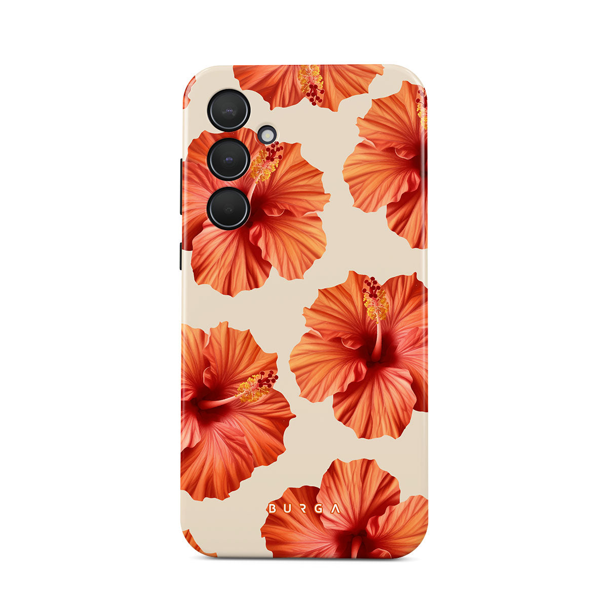 Transport yourself to a lush tropical escape with Bonita. Featuring bold, beautiful hibiscus blooms that pop against a creamy backdrop, this Samsung Galaxy A35 phone case design is perfect for those who dream of vibrant, floral beauty and exotic adventures.