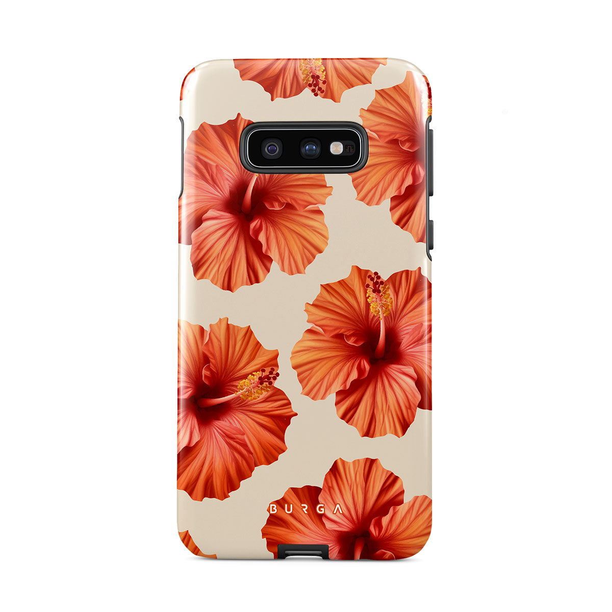 Transport yourself to a lush tropical escape with Bonita. Featuring bold, beautiful hibiscus blooms that pop against a creamy backdrop, this Samsung Galaxy S10E phone case design is perfect for those who dream of vibrant, floral beauty and exotic adventures.