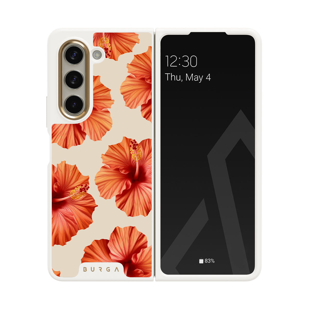 Transport yourself to a lush tropical escape with Bonita. Featuring bold, beautiful hibiscus blooms that pop against a creamy backdrop, this Samsung Galaxy Z Fold 5 phone case design is perfect for those who dream of vibrant, floral beauty and exotic adventures.