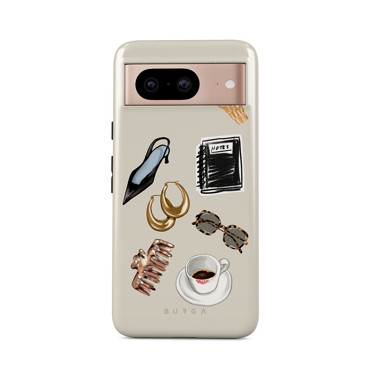 This design features: black high heel, gold hoop earrings, black notebook, coffee cup, tortoiseshell glasses, brown scrunchie, retro gold watch