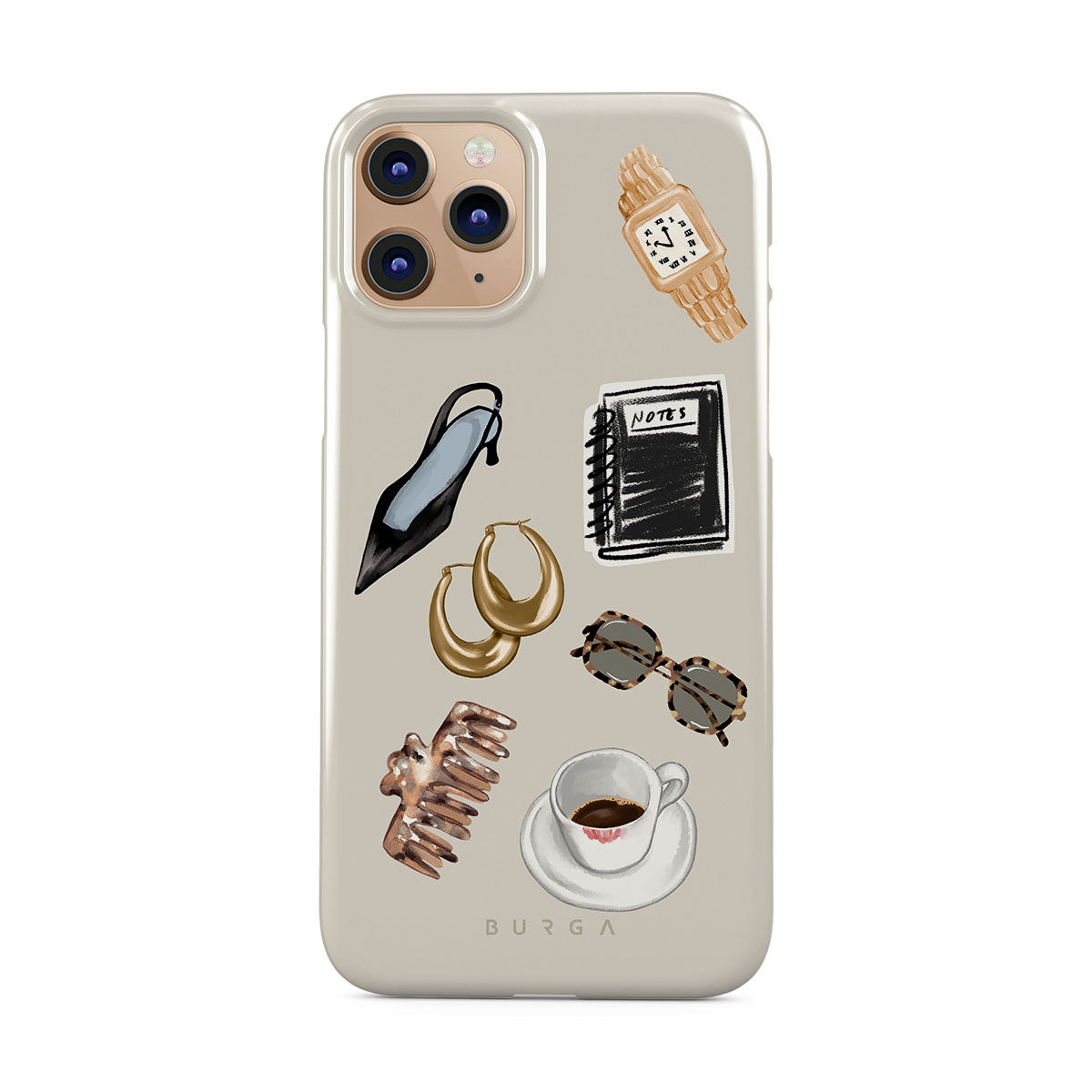 This design features: black high heel, gold hoop earrings, black notebook, coffee cup, tortoiseshell glasses, brown scrunchie, retro gold watch