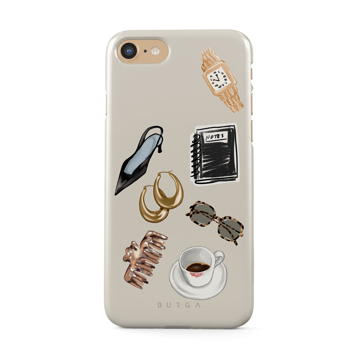 This design features: black high heel, gold hoop earrings, black notebook, coffee cup, tortoiseshell glasses, brown scrunchie, retro gold watch