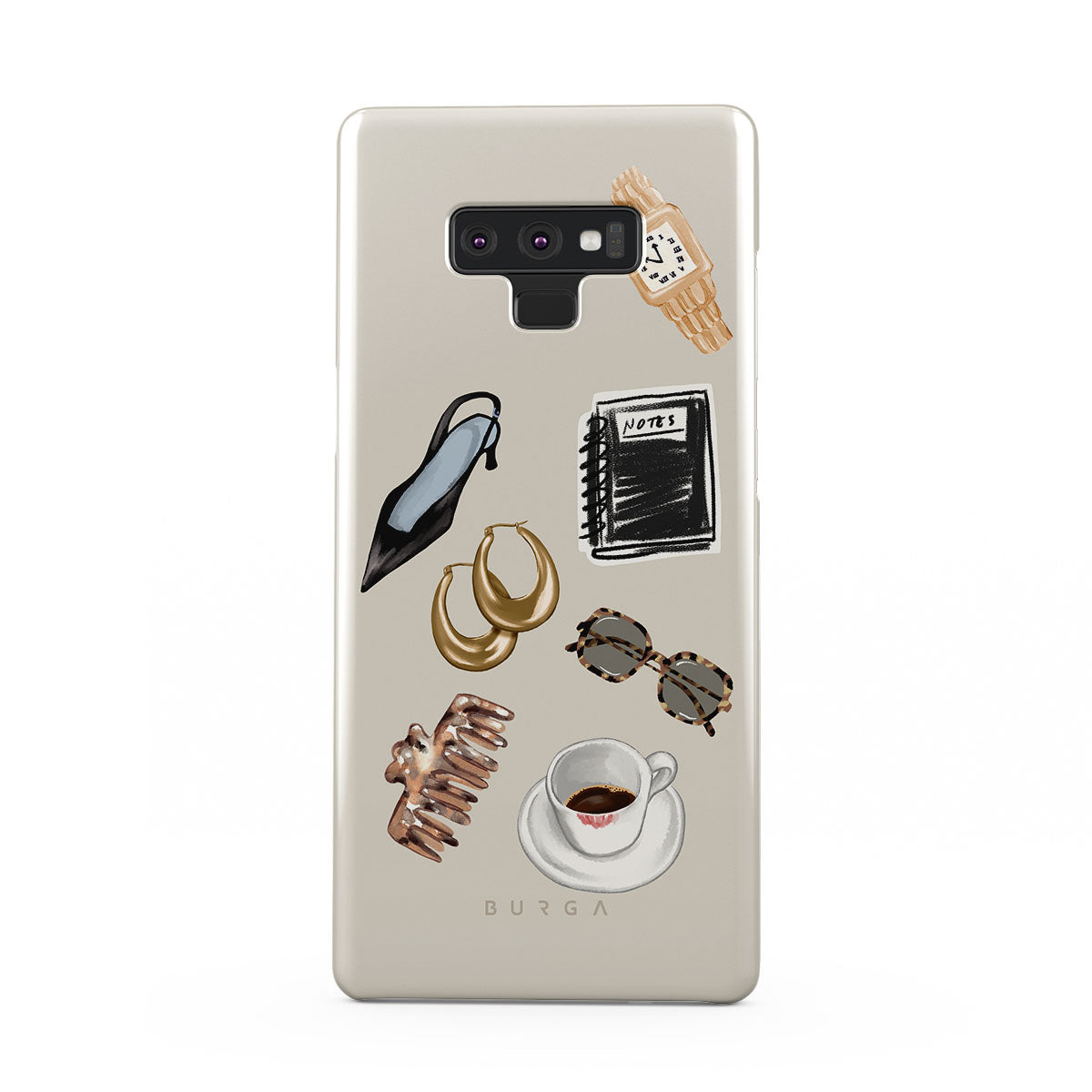 This design features: black high heel, gold hoop earrings, black notebook, coffee cup, tortoiseshell glasses, brown scrunchie, retro gold watch