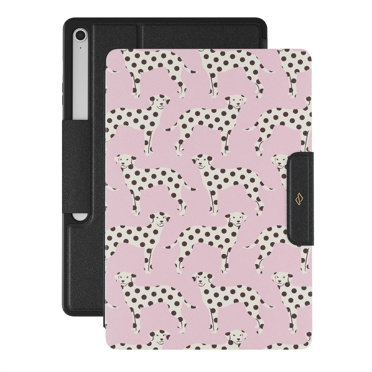 This design features: dalmatians on a baby pink background, dogs.