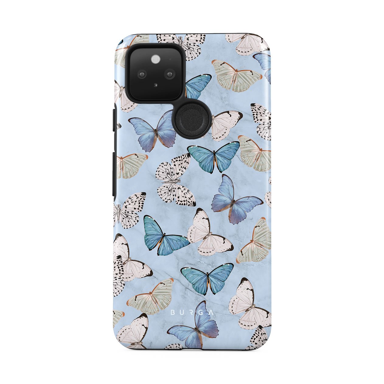 Pastel blue and a playful pattern of summery butterflies create a dreamy combination in our Google Pixel 5 phone case. Carry the feeling of the butterflies in your stomach while protecting your phone from any dangers, as the hard-shell case will keep it sound and safe.
