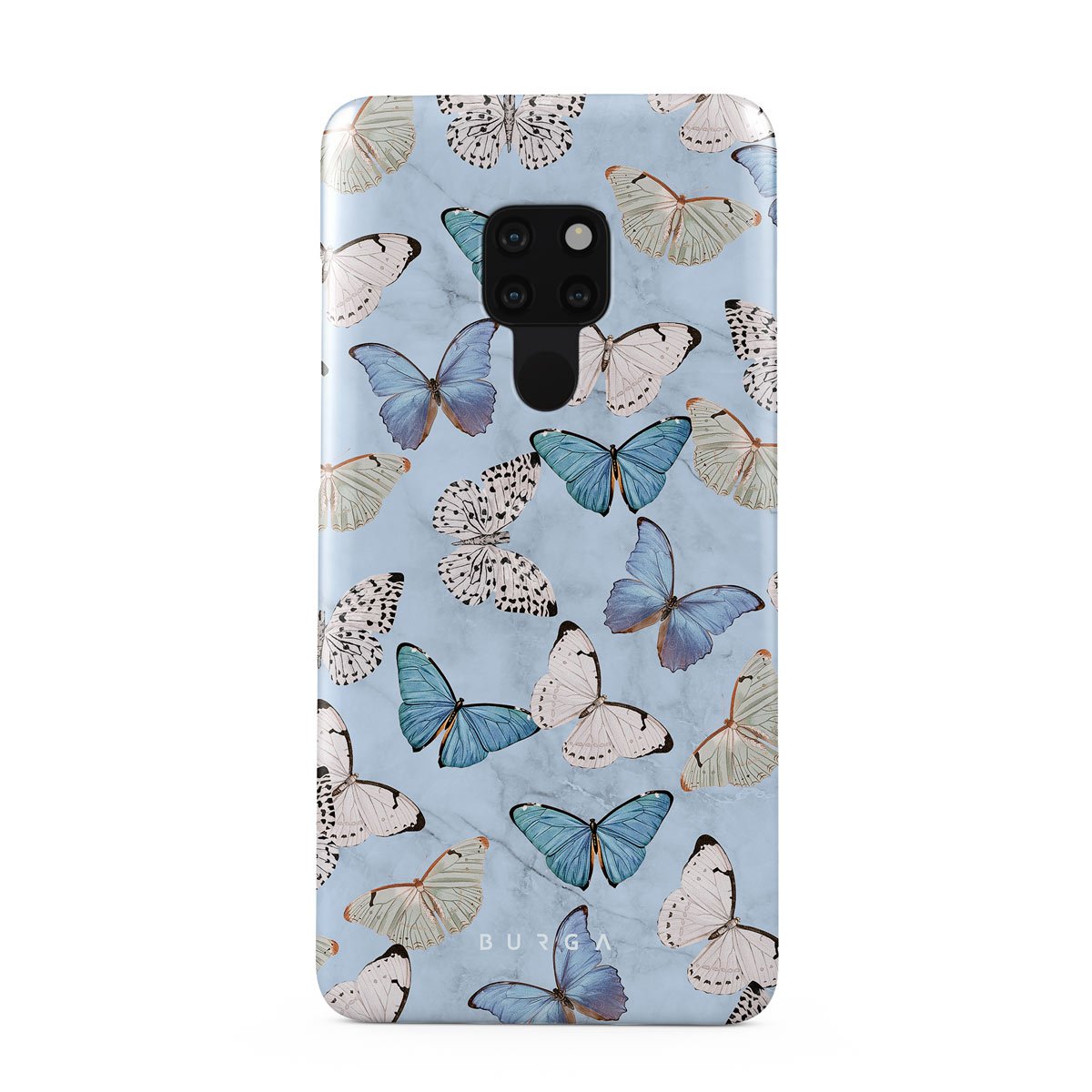 Pastel blue and a playful pattern of summery butterflies create a dreamy combination in our Huawei Mate 20 phone case. Carry the feeling of the butterflies in your stomach while protecting your phone from any dangers, as the hard-shell case will keep it sound and safe.