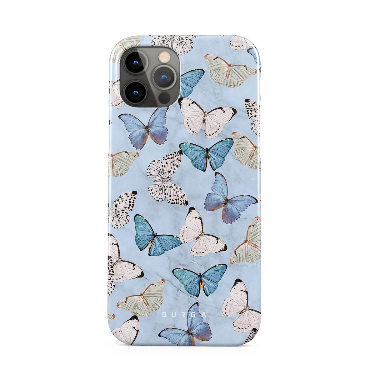 Pastel blue and a playful pattern of summery butterflies create a dreamy combination in our iPhone 12 Pro Max phone case. Carry the feeling of the butterflies in your stomach while protecting your phone from any dangers, as the hard-shell case will keep it sound and safe.