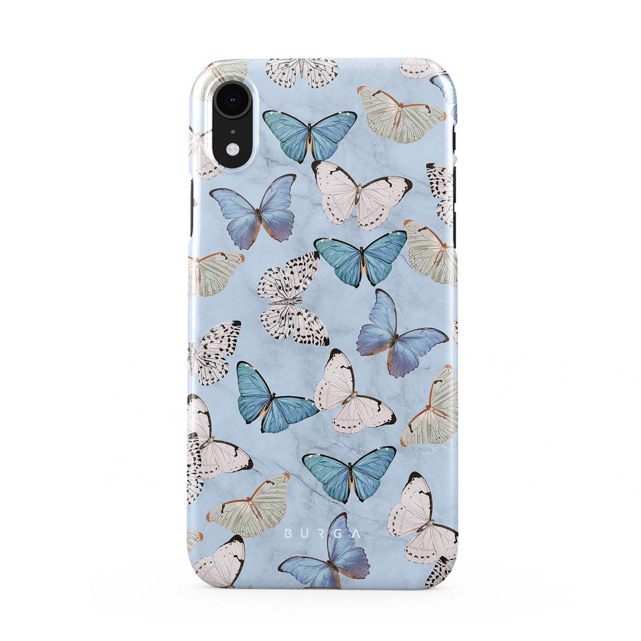 Pastel blue and a playful pattern of summery butterflies create a dreamy combination in our iPhone XR phone case. Carry the feeling of the butterflies in your stomach while protecting your phone from any dangers, as the hard-shell case will keep it sound and safe.
