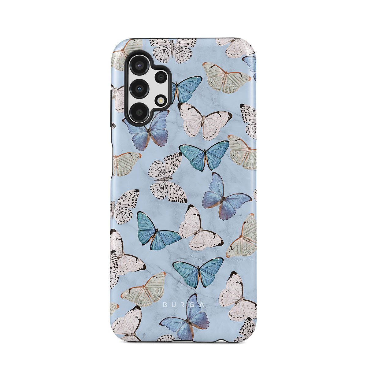 Pastel blue and a playful pattern of summery butterflies create a dreamy combination in our Samsung Galaxy A13 4G phone case. Carry the feeling of the butterflies in your stomach while protecting your phone from any dangers, as the hard-shell case will keep it sound and safe.