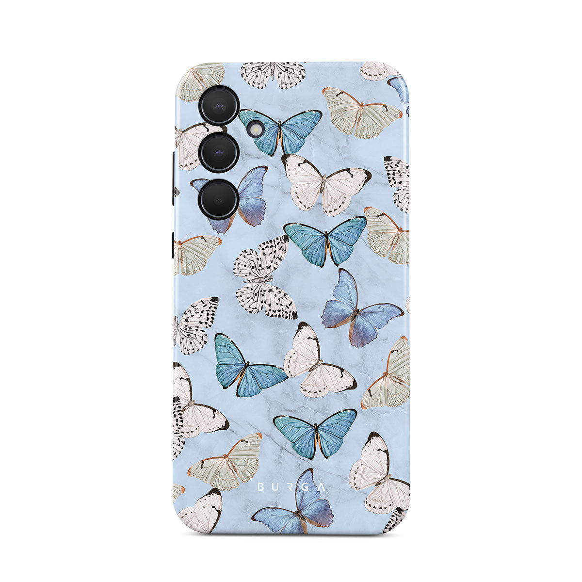 Pastel blue and a playful pattern of summery butterflies create a dreamy combination in our Samsung Galaxy A51 phone case. Carry the feeling of the butterflies in your stomach while protecting your phone from any dangers, as the hard-shell case will keep it sound and safe.