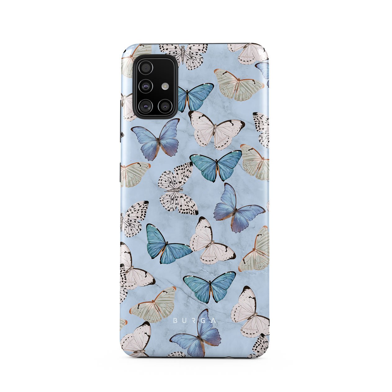 Pastel blue and a playful pattern of summery butterflies create a dreamy combination in our Samsung Galaxy A71 phone case. Carry the feeling of the butterflies in your stomach while protecting your phone from any dangers, as the hard-shell case will keep it sound and safe.