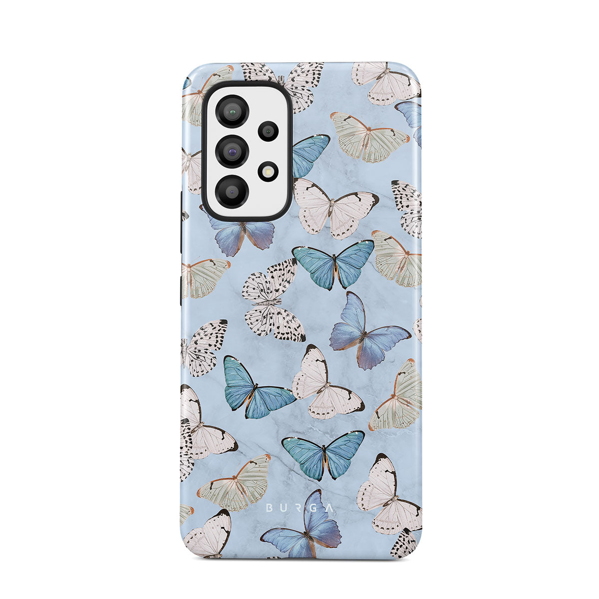 Pastel blue and a playful pattern of summery butterflies create a dreamy combination in our Samsung Galaxy A72 phone case. Carry the feeling of the butterflies in your stomach while protecting your phone from any dangers, as the hard-shell case will keep it sound and safe.