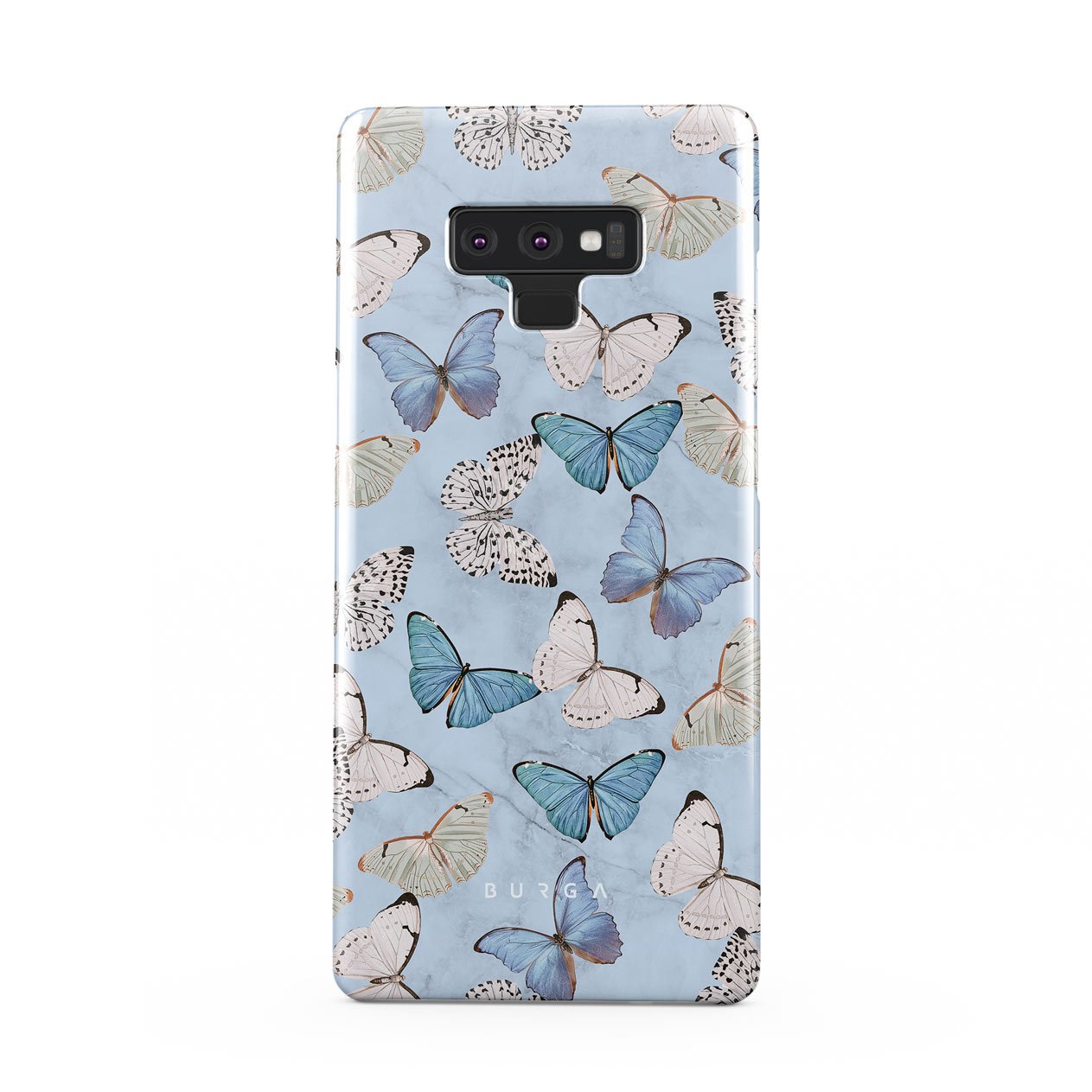 Pastel blue and a playful pattern of summery butterflies create a dreamy combination in our Samsung Galaxy Note 9 phone case. Carry the feeling of the butterflies in your stomach while protecting your phone from any dangers, as the hard-shell case will keep it sound and safe.