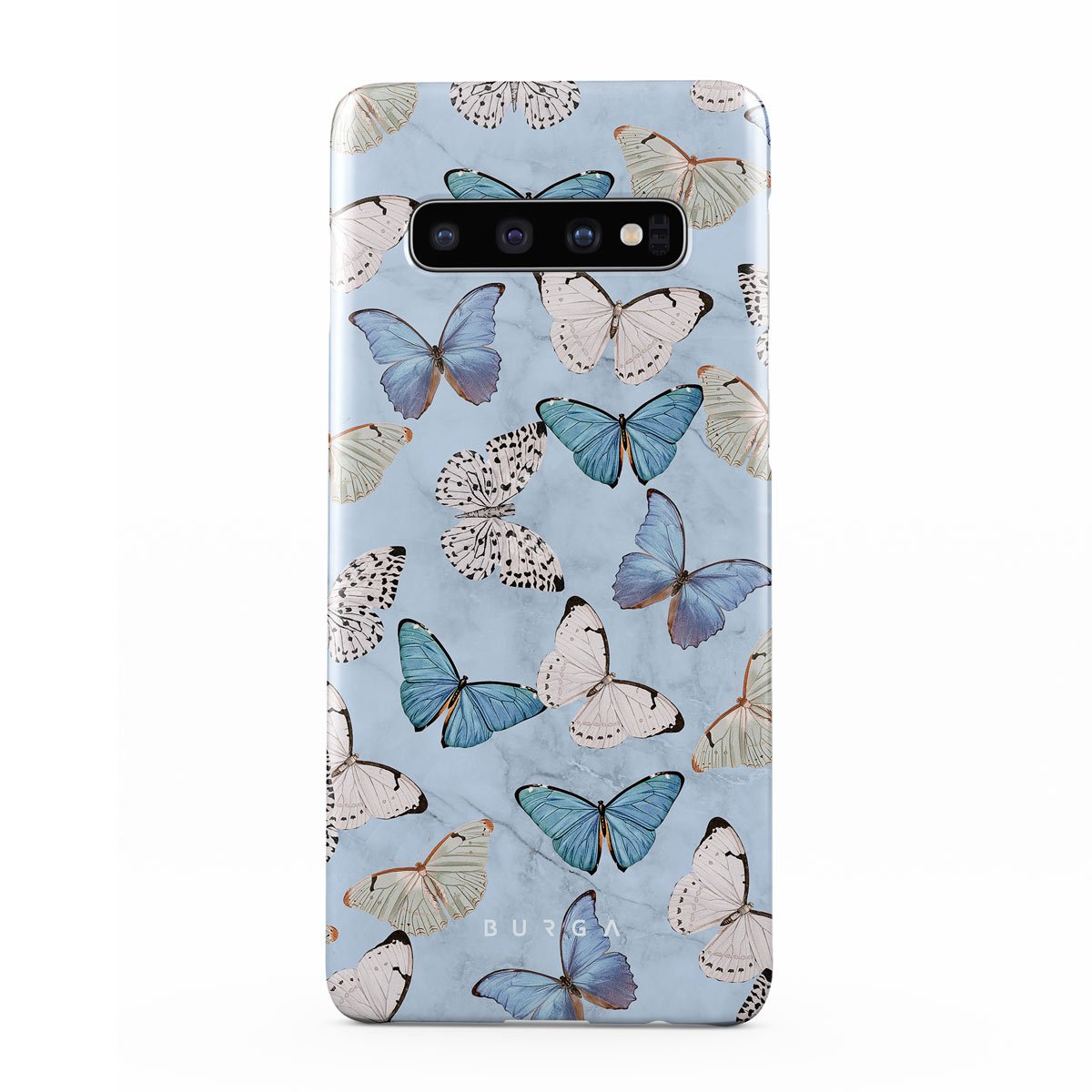 Pastel blue and a playful pattern of summery butterflies create a dreamy combination in our Samsung Galaxy S10 Plus phone case. Carry the feeling of the butterflies in your stomach while protecting your phone from any dangers, as the hard-shell case will keep it sound and safe.