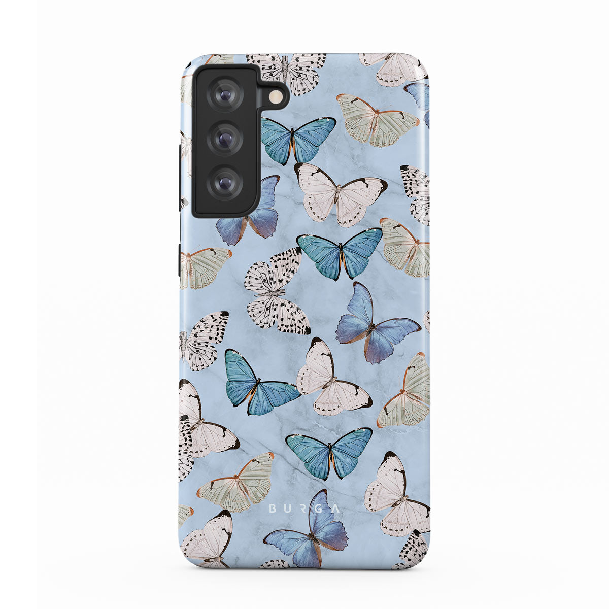Pastel blue and a playful pattern of summery butterflies create a dreamy combination in our Samsung Galaxy S21 FE phone case. Carry the feeling of the butterflies in your stomach while protecting your phone from any dangers, as the hard-shell case will keep it sound and safe.